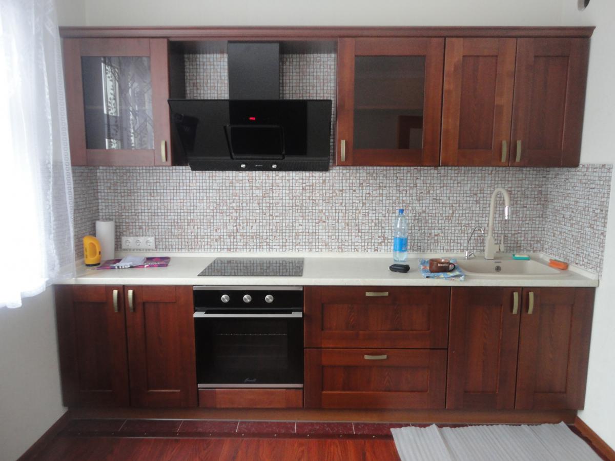 Моя первая кухня из Ликариона: шпон ясеня, 2,95 длина, вытяжка на 90 см. Еще (на фото нет) отдельностоящий блок с ящиком для столовых приборов, с местом под СВЧ, двумя полками за дверкой. Фартук мозаичной вдоль кухни и под вытяжкой, под кухней выложено плиткой. Мойка из искусственного камня, смеситель с отделкой в тон мойке,