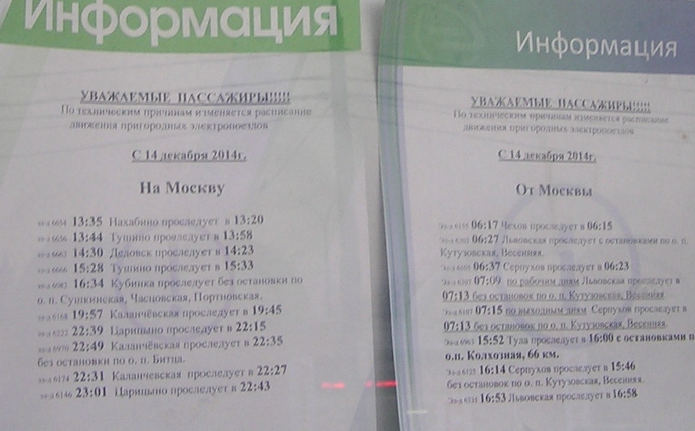 Не стыдитесь, пожалуйста! Спасибо за сообщение! Я вот открыл данную тему и обнаружил сообщение о том, что ввели новое расписание.летучка писал(а):Если в Яндексе можно быстро найти все изменения в расписании электричек со станции Подольск в связи со вводом нового годового расписания с 14 декабря 2014 г., то мне будет очень стыдно за такой глупый поступок.