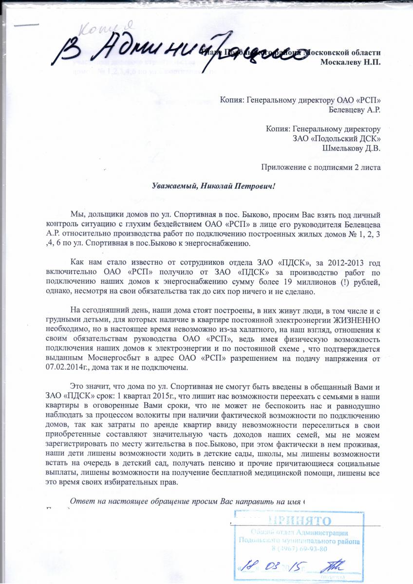 Мы, дольщики домов по ул. Спортивная в пос. Быково, просим Вас взять под личный контроль ситуацию с глухим бездействием ЗАО «РСП» в лице его руководителя Белевцева А.Р. относительно производства работ по подключению построенных жилых домов № 1, 2, 3 ,4, 6 по ул. Спортивная в пос.Быково к энергоснабжению.