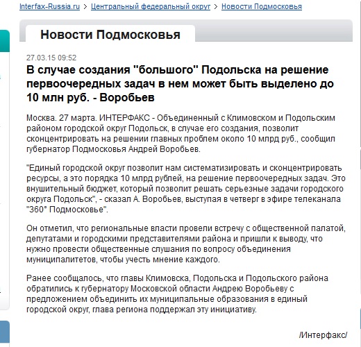 …инициатива города о присоединении к нему двух муниципальных образований: Подольского района и Климовска