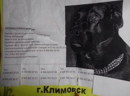 Андрей221 писал(а):Собака, по морде сучка, похожа на лабрадора, видно ухожена с большим ошейником- браслетом, сидит у выхода на вторую платформу ст.Подольск, ищет хозяина.