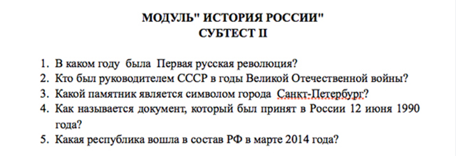 Первый вариант усложненного экзамена по истории России будет состоять из двух субтестов — общего (одинакового для всех категорий мигрантов), состоящего из 20 вопросов с вариантами ответов, и дополнительного — для тех, кто собирается получать вид на жительство. Во второй части теста три вопроса обязательно будут посвящены русской истории IX—XX веков, а остальные два задания должны показать знание иностранцами новейшей истории России.