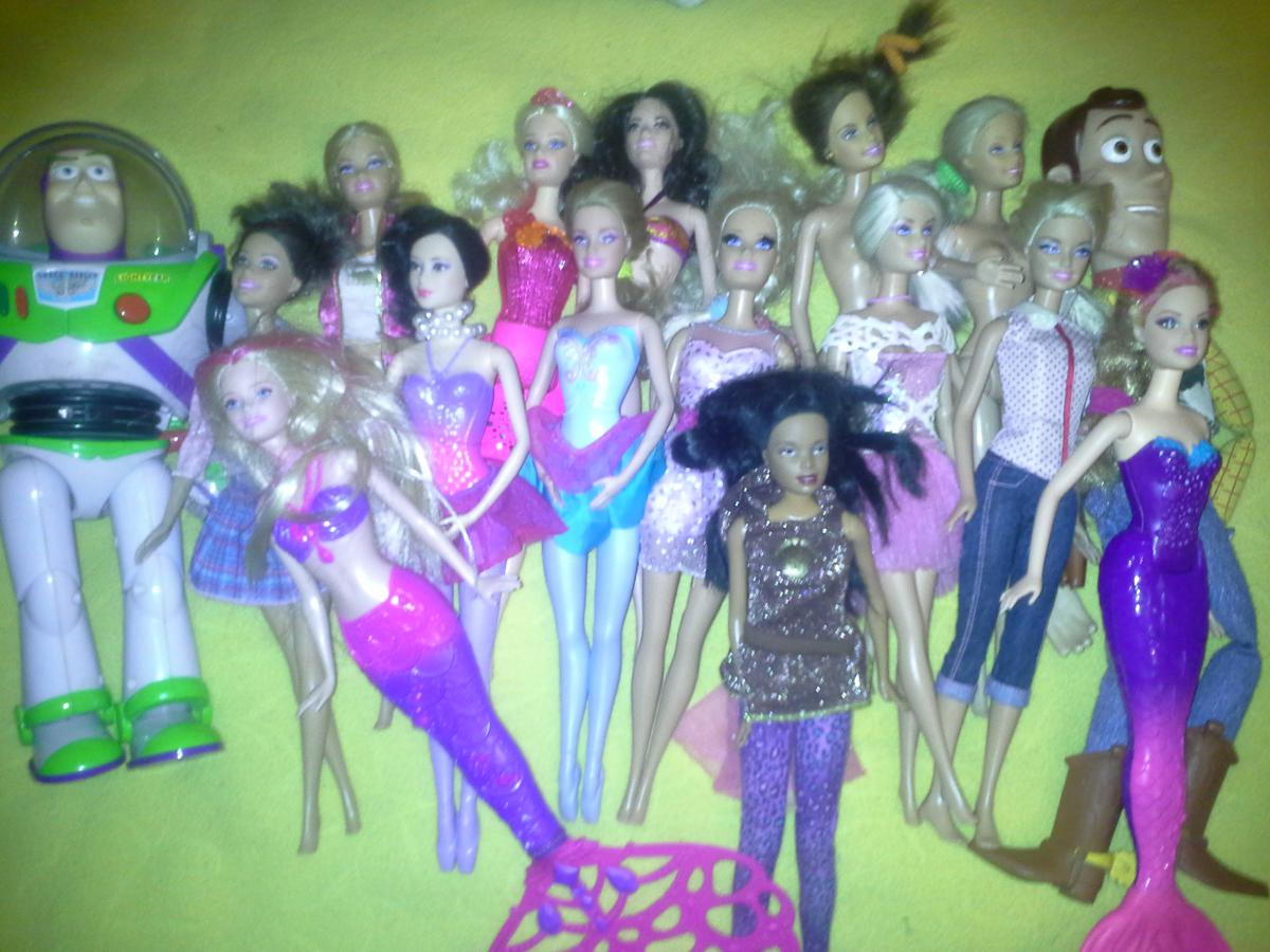 Некоторые барби с мужьями пришли. Кому-то повезло в мужья оторвать ковбоя и робота из мультика "история игрушек", остальным меньше повезло- у них мужья динозавры. Все как в жизни!)