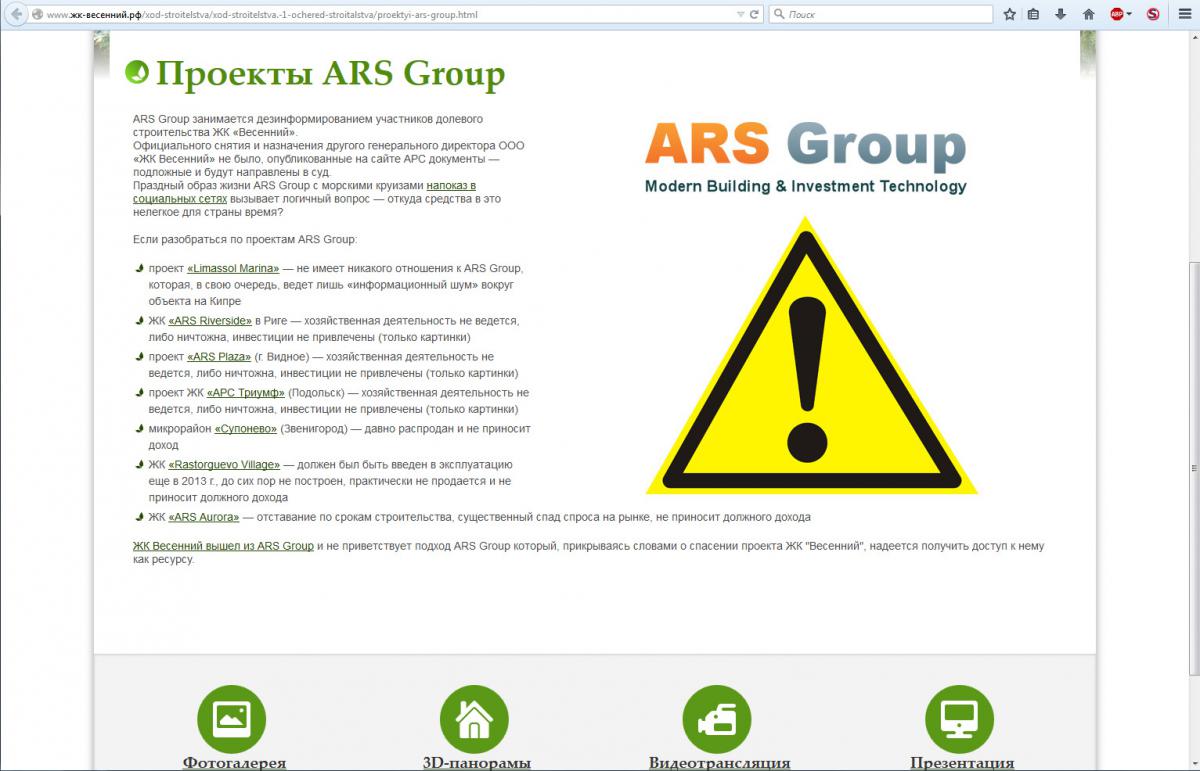 начала искать инфу в интернете о строительстве объектов АРС Групп, Расторгуево вилладж действительно строят с 2011 года, никак построить не могут (эта инфа была в сообщении, удаленном с сайта ЖК Весенний). в удаленном сообщении говорилось обо всех объектах АРСа, один за другим, якобы это все картинки и долгострои, без каких-либо реальных финансовых вложений. а "дискредитация" ЖК Весеннего - попытка влезть в строительство и получить денег. голова кругом идет