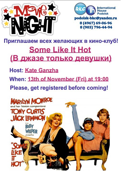 Школа иностранных языков BKC-ih Podolsk приглашает всех желающих в кино-клуб Movie Night.