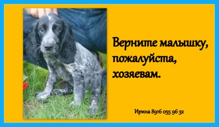14.06.2015 пропал щенок русского спаниеля около 11 вечера. Сука. Возраст 3 месяца, окрас черно-пегий, на шее жёлтый и коричневый ошейники. На ошейнике адрес хозяев. В паху клеймо.