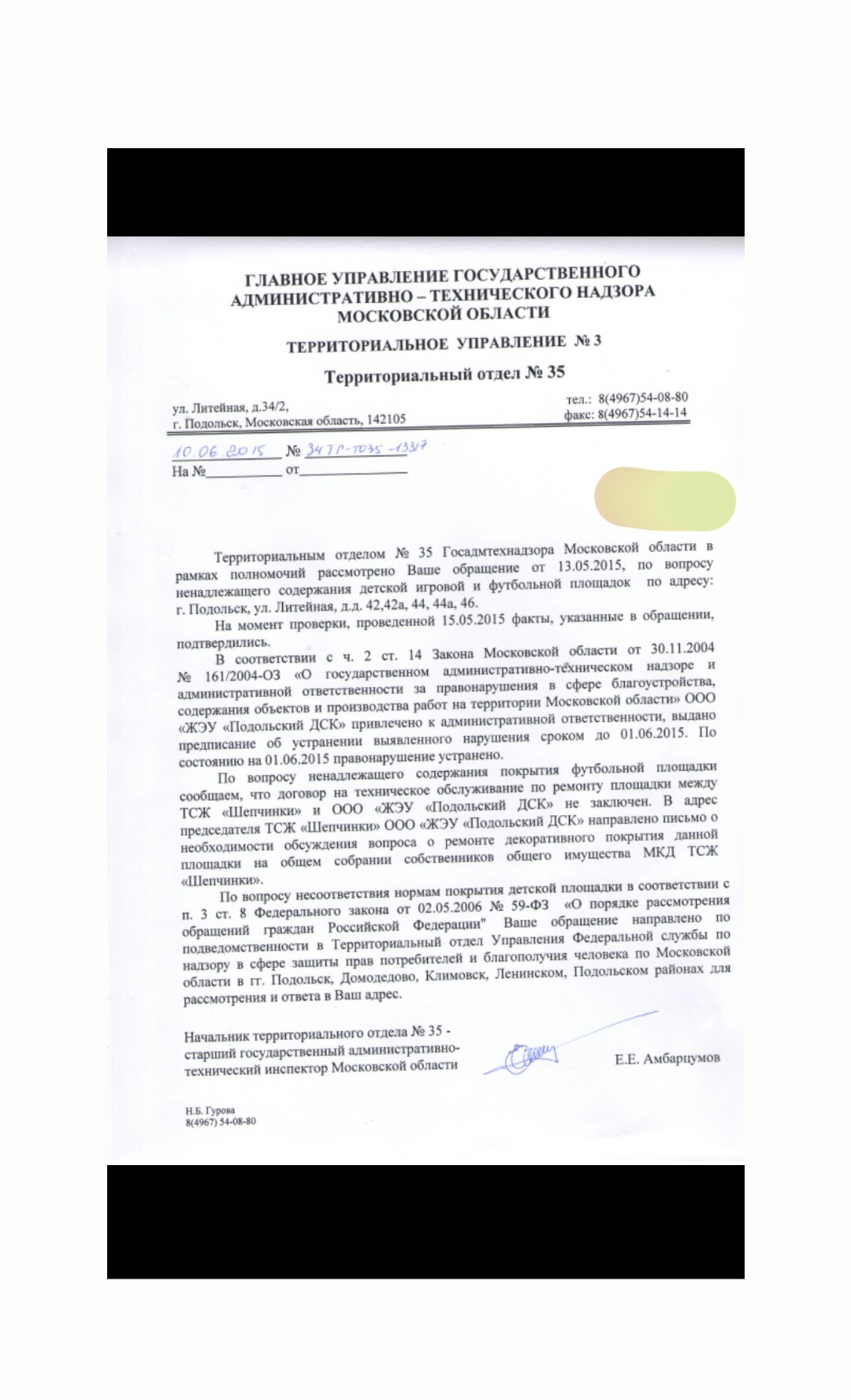 По результатам проверки прошу обязать УК ЖЭУ «ПДСК» заменить покрытие на современное, либо проводить соответствующие мероприятия по дезинфекции, просеиванию и смене песка согласно действующим правилам, а так же уделять внимание остальным элементам площадки.