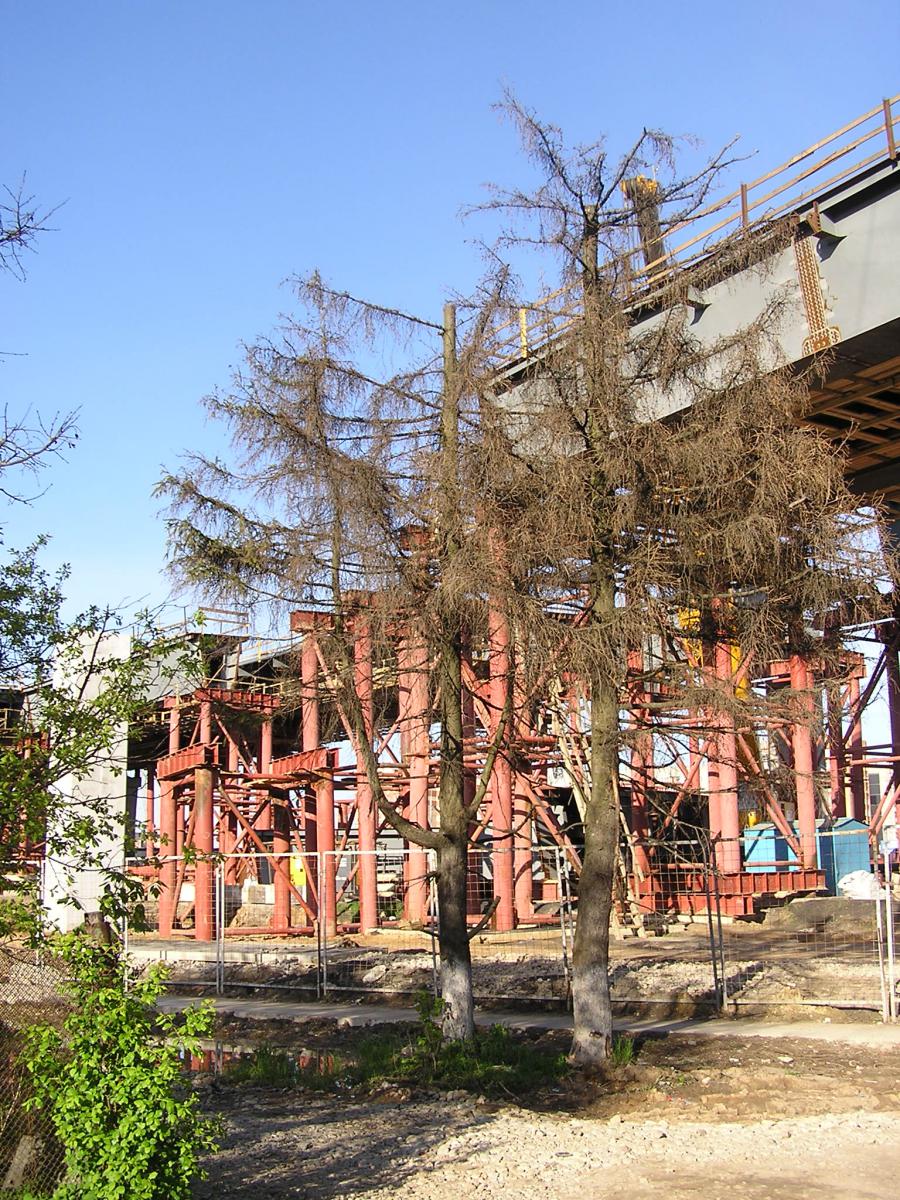 Ели у эстакады засохли. Но не по вине строителей ЮО, а благодаря энергетикам, которые тащили в прошлом году провода к новостройке (Климовск, Молодежная, 3). Почему-то они уверены, что спиливать верхушки у деревьев можно без всяких разрешений (в том числе на частных владениях). А такая гильотина для ели - верная смерть.