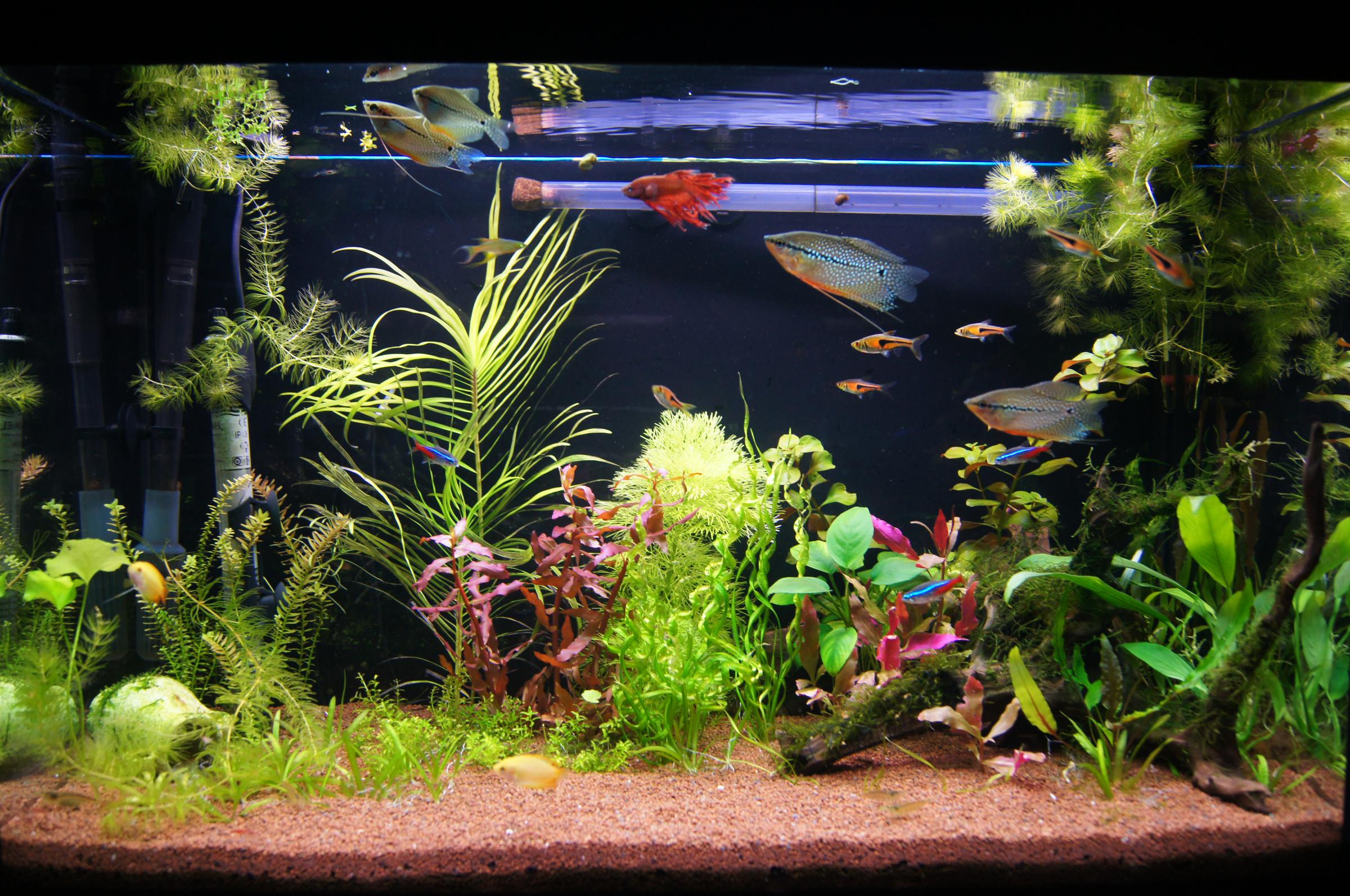 Эйхорния у меня уже довольно давно, и до перезапуска стояла под флейтой. Чернеют только нижние листья, скорее всего от того, что света мало. Посмотрю, может потом пересажу. Это пока черновой вариант перепланировки.