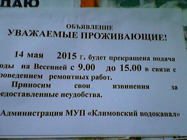 http://www.podolsk.ru/news/p2_articleid/13638в связи с проведением ремонтных работ на станции обезжелезивания воды поселка Львовский Подольского муниципального района 13 августа с 9.00 до 15.00 полностью будет отключена подача воды в поселок.