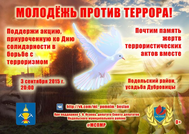 С целью почтить память детей, сотрудников силовых структур, мирных граждан, погибших в ходе теракта в Беслане, #МСПМР в усадьбе #Дубровицы в 20:00 проведёт акцию в память о жертвах террористических актов.