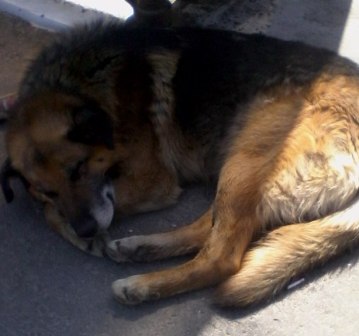 Сегодня на станции возле касс лежала здоровенная собачища (похожа на кавказца, но лежа не поймешь) с ошейником, передняя лапа содрана внизу спереди, довольно большая рана
