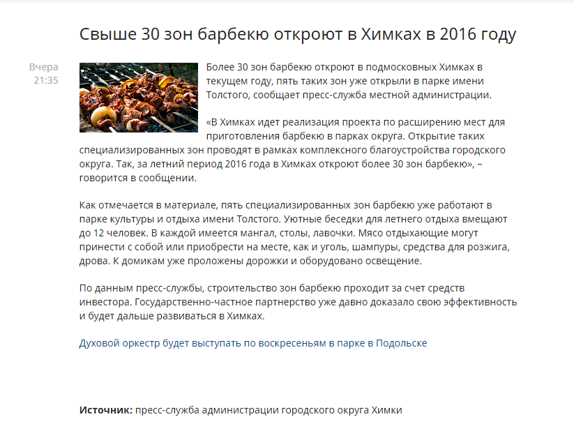 В 2016 г. власти планируют выбрать компанию-оператора, которая организует пикниковые зоны, где будут установлены мангалы и скамейки. Там же отдыхающие смогут взять в аренду мангал, купить сырое мясо и другие товары для барбекю, или же приобрести готовый шашлык. «За организацию процесса и чистоту пикниковой зоны будет отвечать оператор. Таким образом получится организовать культурный отдых, избежать стихийных костров с мусором и алкоголем в парках», - сказала М.Люльчук. По ее словам, в настоящее время Мосгорпарк прорабатывает возможные площадки.