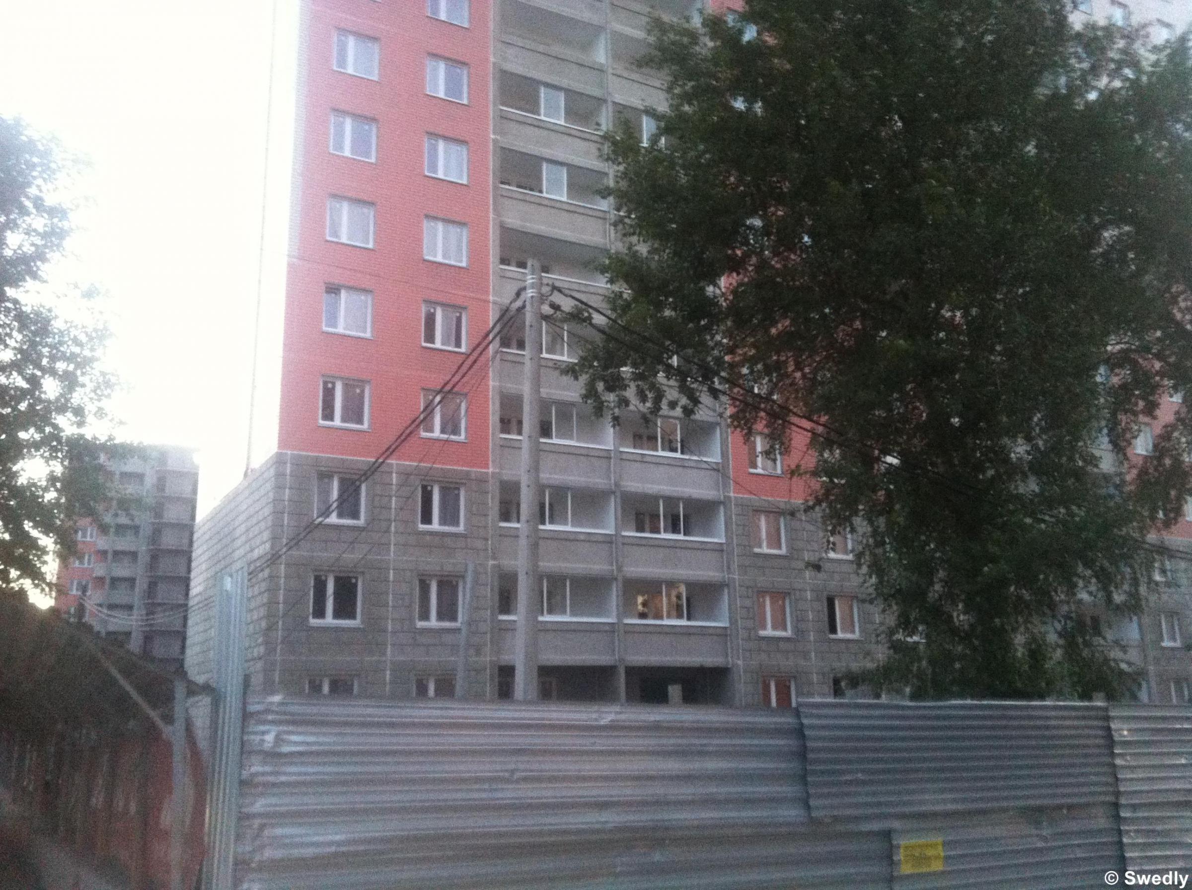 Проводка в полу была залита какой-никакой стяжкой, розетки установлены, выключатели тоже, из потолков просто провода свисали с винтовыми клемниками. В квартире металлический электрощиток с пакетниками (на мою однушку было 8 штук). Радиаторы с экранами как и на Колхозной 20 ставят. Балконы остеклены алюминиевым профилем, подоконников не было. На стояках выходы с шаровыми кранами (в том числе и на отводах под полотенцесушитель). Входная дверь картонная, внутренних нет.