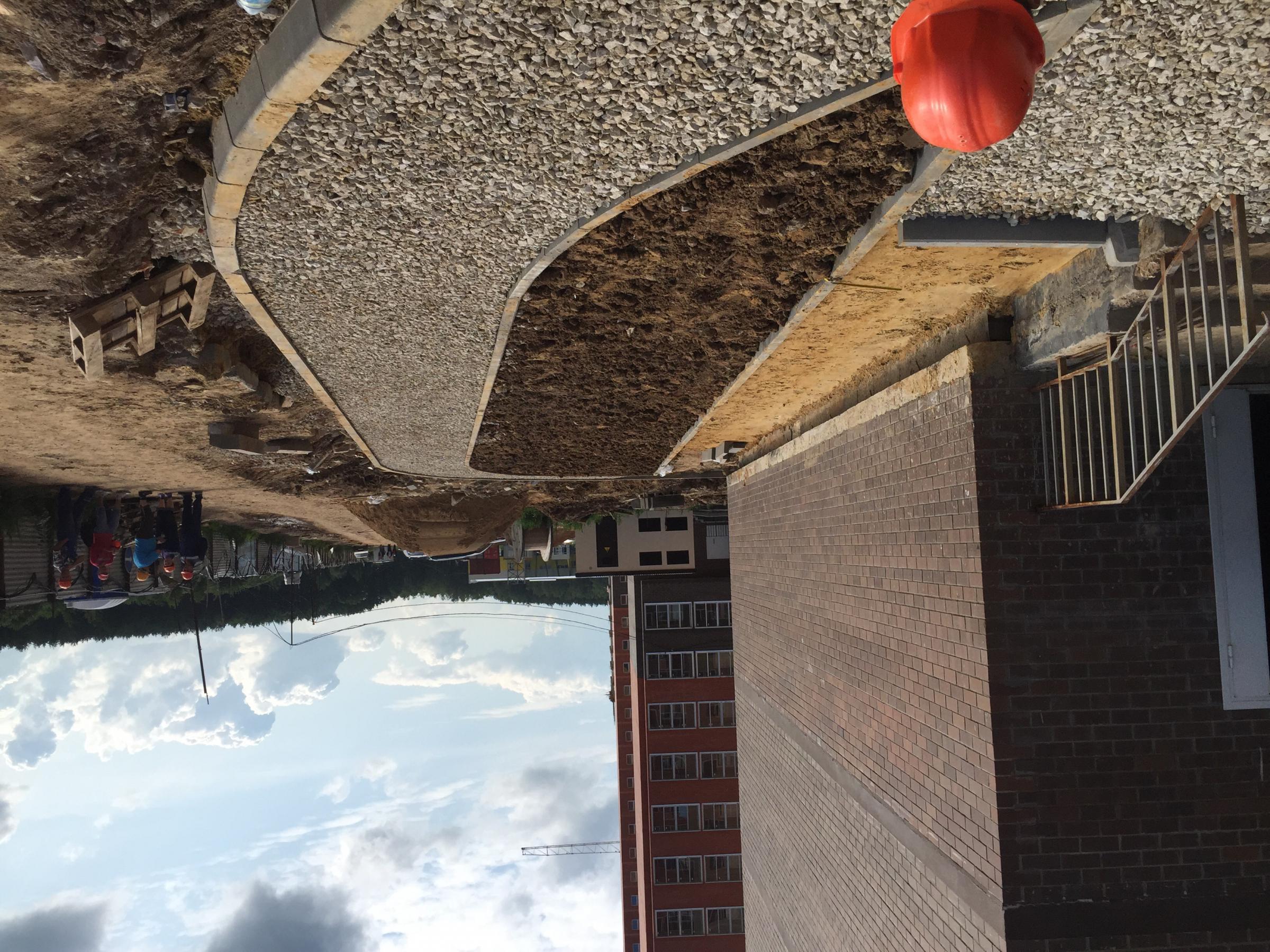 Во дворе 2 корпуса работает эскаватор - насыпает щебень под дорогу и тротуары, работают два человека, пятеро курят.