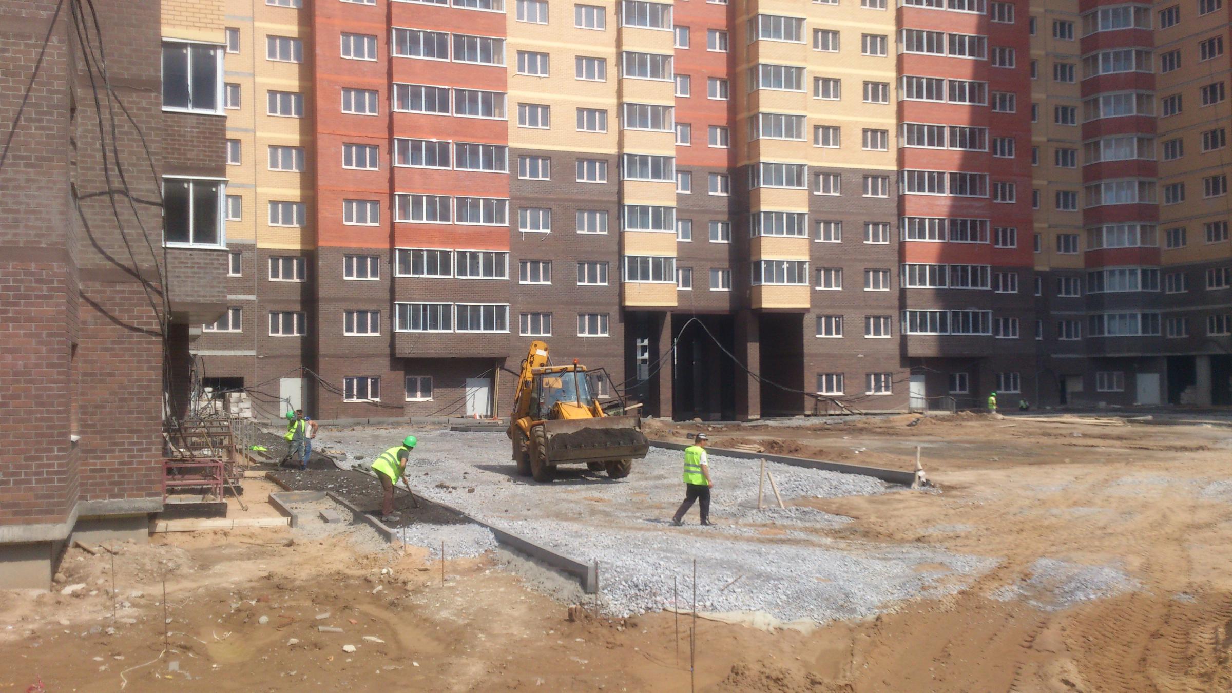 Во дворе 2 корпуса работает эскаватор - насыпает щебень под дорогу и тротуары, работают два человека, пятеро курят.
