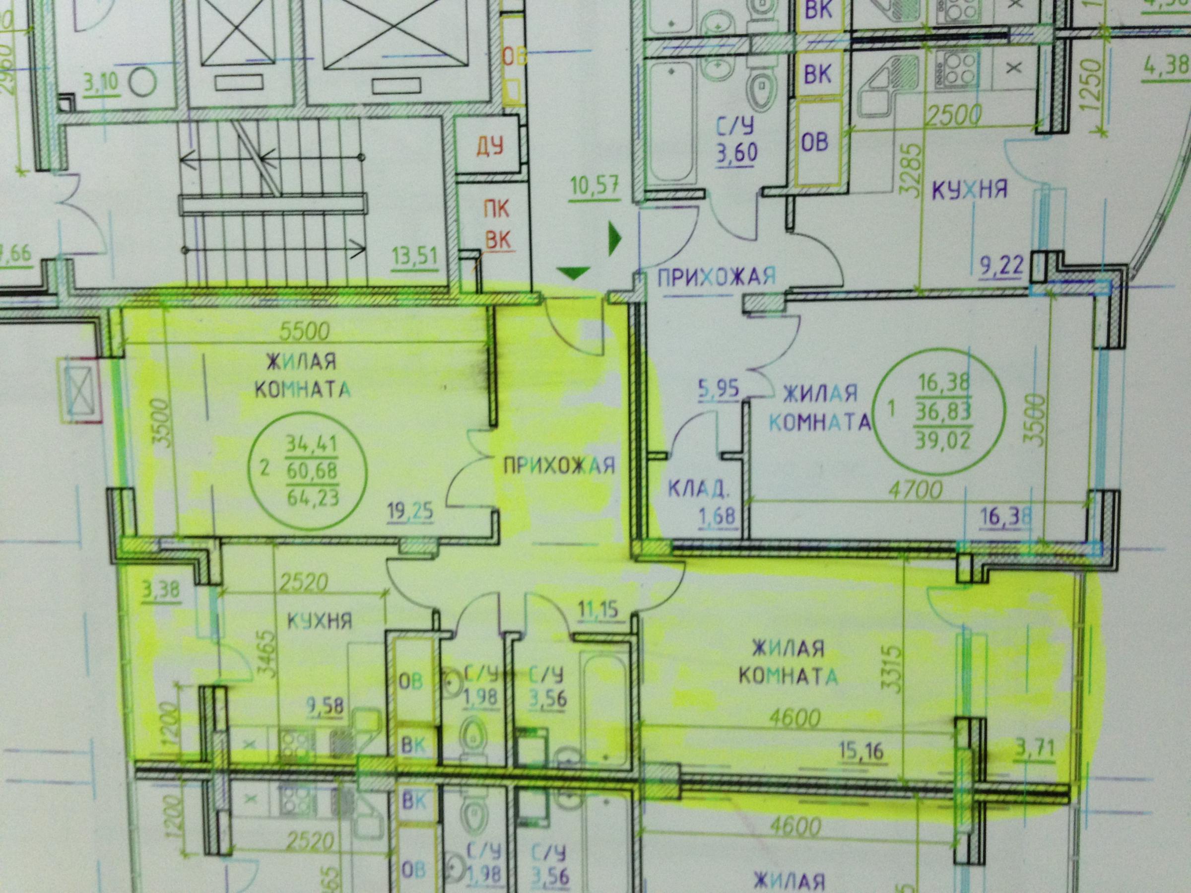 Всем доброго дня! У меня есть такой план двушки 64,23(выделен желтым).