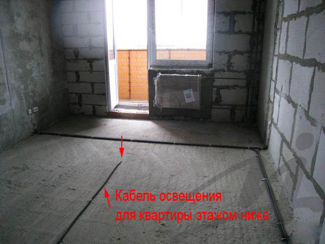 Случайно не так как на фото? Для прокладки кабеля к люстре - кабель прокладывается по перекрытию верхней квартиры, а за тем "ныряет" через перекрытие вниз - к предполагаемой люстре. :D Это фото с реального объекта, где по договору была предусмотрена разводка электрики по дому. А вот стяжка по-моему - (документы если честно - не смотрел) - перекладывалась на плечи владельцев квартир. В нашем случае я так понимаю вряд ли кто-то согласится пропускать кабель "транзитом" через свою квартиру для нижнего соседа.