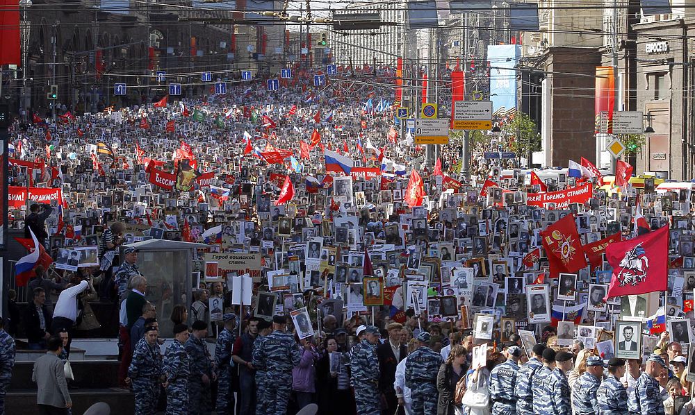 Еще раз отмечу. Пока в видимой части этой акции почти ничего зазорного не видно (разве что напоминает похороны), но ведь так и должно быть по плану - иначе акцию не получится конвертировать в традицию. Через несколько лет, если пустить это дела на самотек (т.е. не перехватывать инициативу у сегодняшних организаторов), уверен, мы увидим на этих шествиях не только портреты погибших на поле боя, но и много других картинок и лозунгов. Кроме того, противник уже давно пытается всеми способами принизить и нивелировать победу СССР в той войне (попытки приравнять Сталина к Гитлеру, замалчивание и искажение фактов, и последнее нововведение на Украине - замена одной ВОВ на 7 локальных войн, в которых СССР обходится, а Россия участвует только в 3-х из них), и это еще одна функция сего мероприятия - не сиюминутная, а долгосрочная.