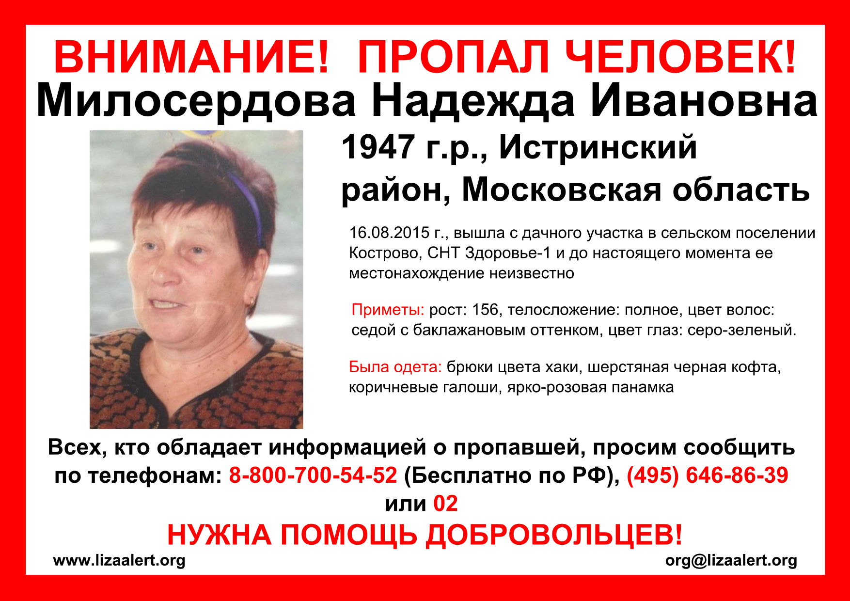 Аллу Акимовну до сих пор не нашли. Репортаж по ТВ360 http://360tv.ru/news/poiski-propavshej- ... deli-32656Шамора писал(а):В ориентировке указан Домодедовский район, на самом деле это ошибка: район Подольский.
