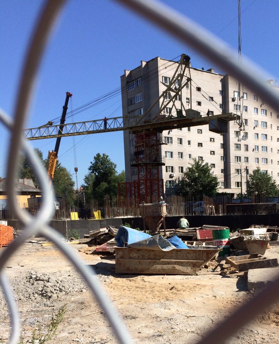 Были сегодня на стройке. Вокруг крана суетилось много людей. Дополнительно работал автокран. Начали завозить кирпичи. Пока их правда немного. Вообщем стройка идет