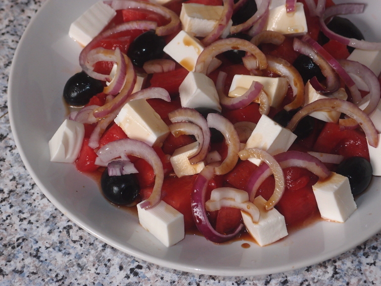 Арбуз очищаем от кожуры и косточек, режем кубиками. Выкладываем на тарелку. Сверху выкладываем несколько маслинок и кубики сыра Фета. Сверху - красный лук, нарезанный полукольцами. Добавляем пару капель бальзамика и сбрызгиваем соевым соусом. Заправляем растительным маслом.