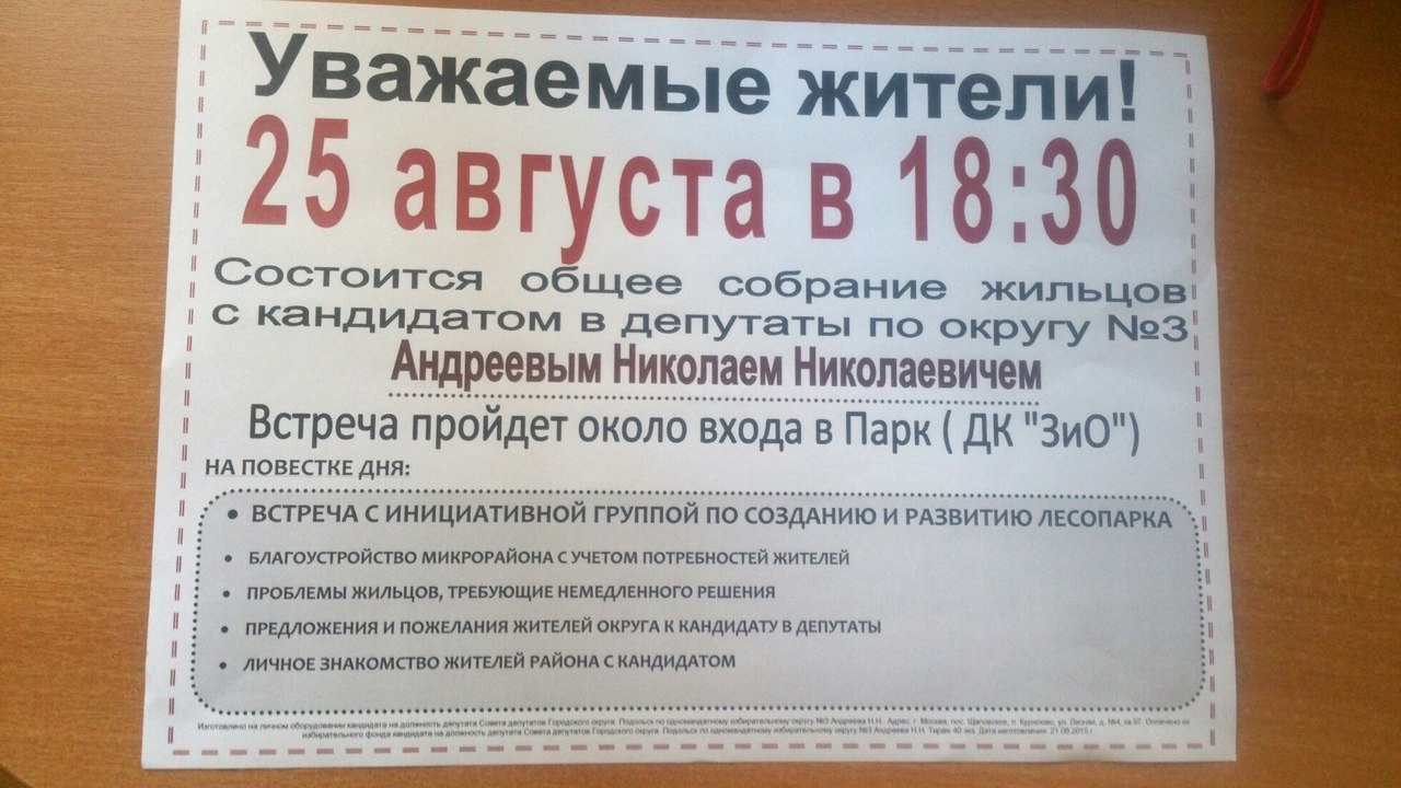 25 августа в 18-30 состоится встреча с кандидатом в депутаты по Северному Андреевым.