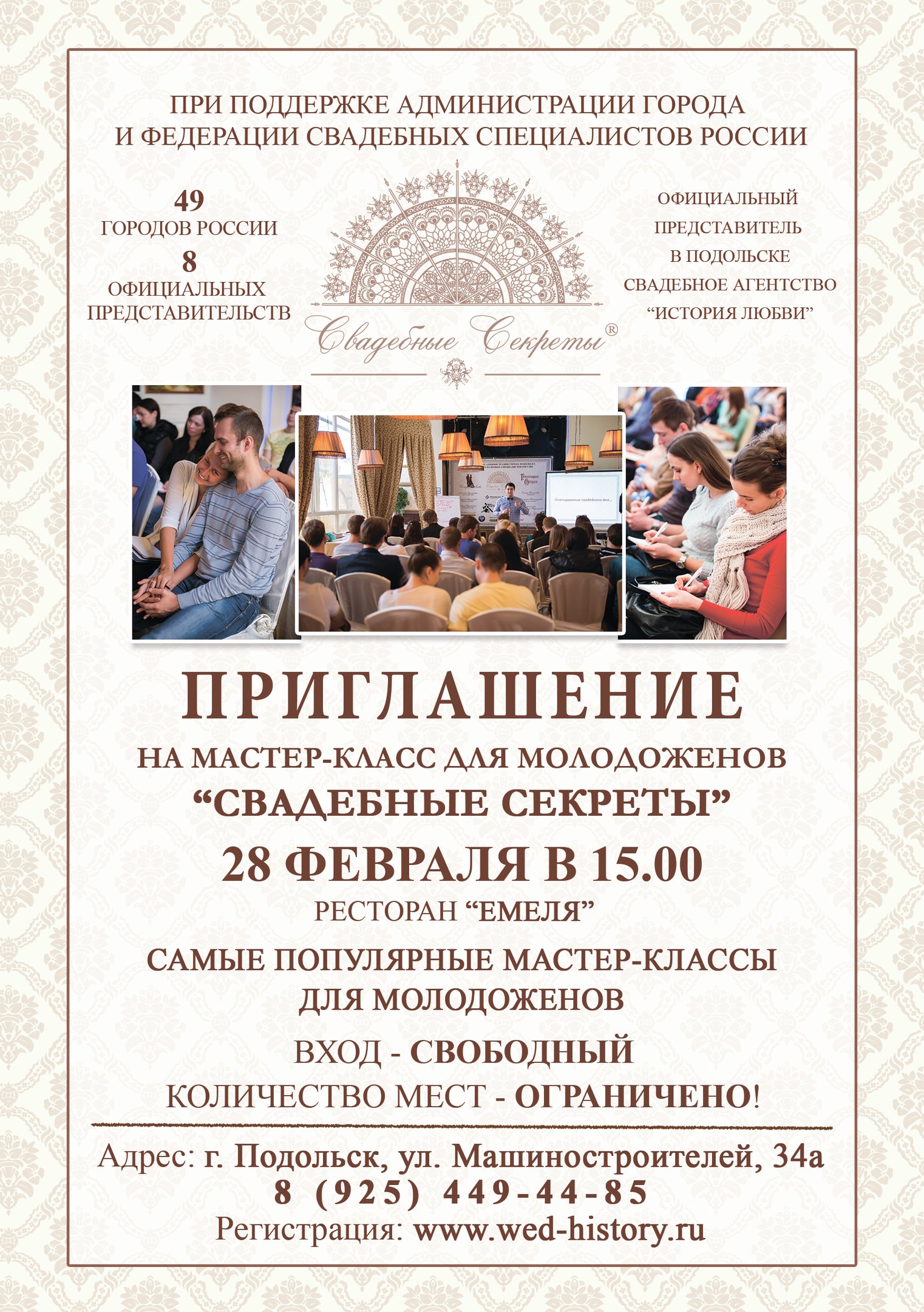 Уже четвертый год наше агентство проводит в Подольске мастер-класс для молодоженов «Свадебные Секреты». За это время он стал супер популярным!