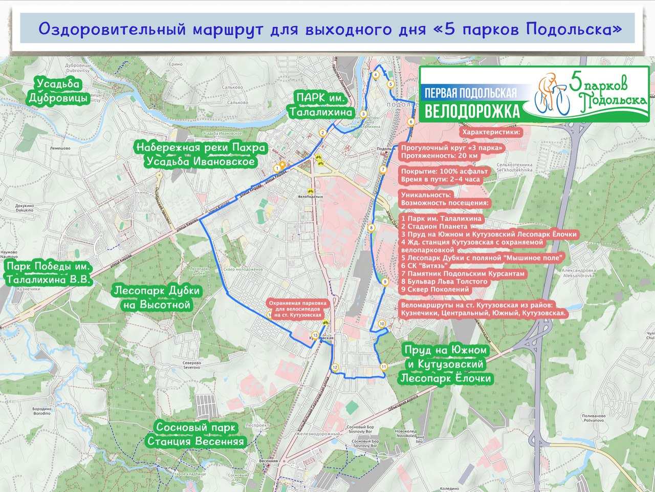 протяженностью около 20 км, которая свяжет непрерывным кольцевым маршрутом городской парк культуры и отдыха им. В.Талалихина, парк «Елочки» в районе «Кутузово», парк на ст. «Весенняя», лесопарк «Дубки» и набережную реки Пахры близ усадьбы «Ивановское».