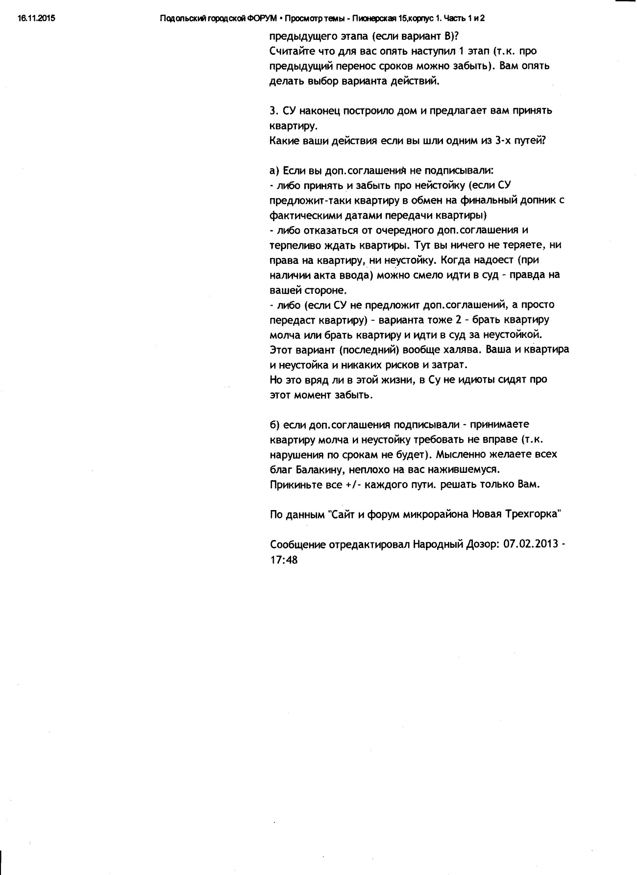Я так понимаю, что в ДДУ за последний год по дому №2 все же фигурирует срок июнь 2016 + 6 месяцев. А срок декабрь 2015 наверно на самой ранней стадии продаж по этому дому фигурировал. Но так извините меня, люди, кто оформил такие ДДУ, как мне кажется переплатили, по сравнению с тем, если бы срок все же был на полгода больше. Почему же никто им не предлагает вернуть эту разницу совместно с подписанием допника?