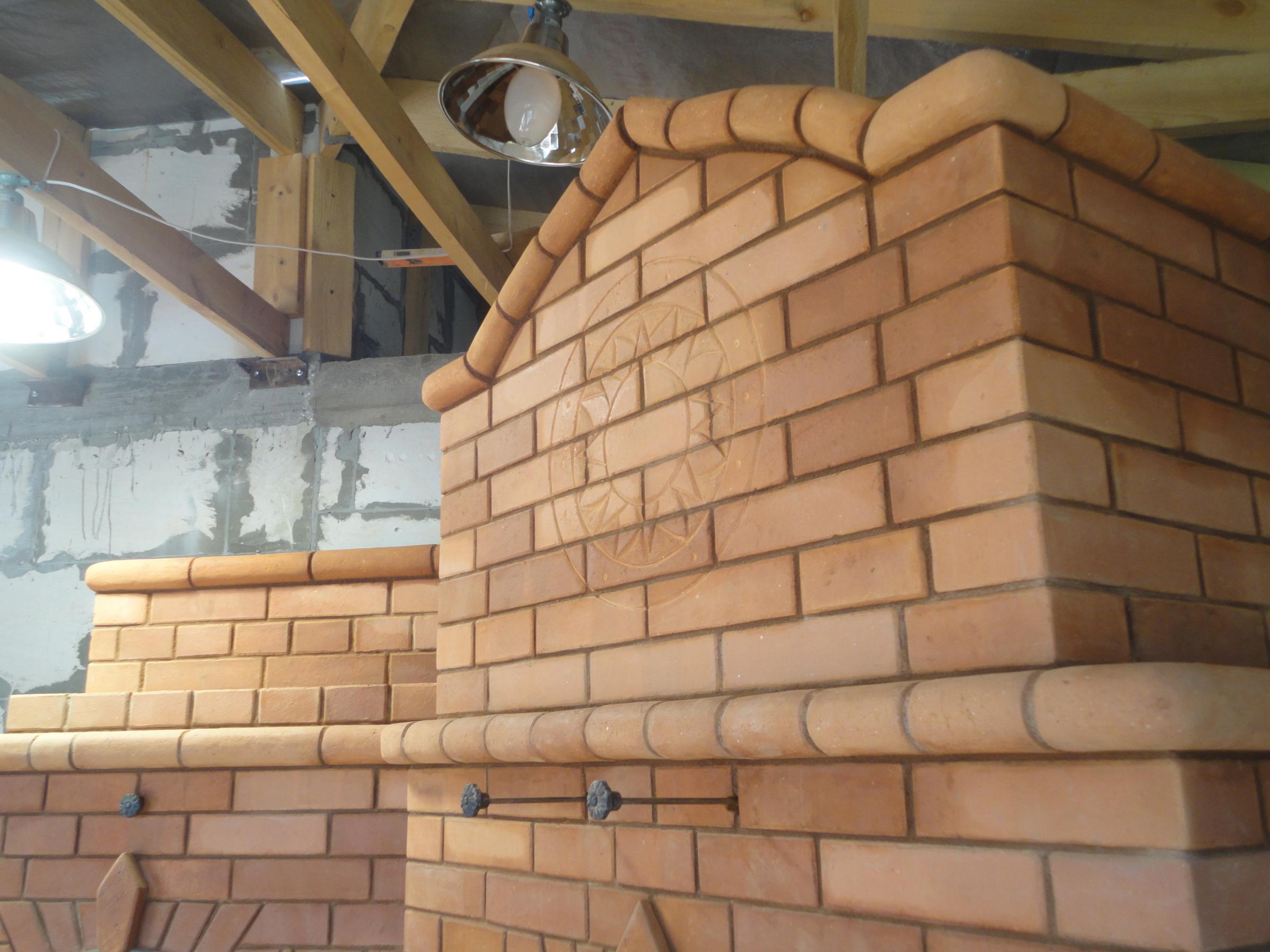 Теперь о том, что же Вас ждет если Вы решились сделать себе печь или другую печную конструкцию. Первоначальный этап выбор конструкции я думаю мы уже обсудили.Следующим этапом мы выбираем материал и фурнитуру,и производим расчет его колличества.Выбор в настоящее время очень богатый.И вопрос этот так же индивидуален.Отмечу лишь что подобрав материал,он приедет к нам сам, по списку.Дальше идет подготовка рабочих мест. Т.к. в ходе возведения очага идет очень много резки кирпича, его обработка.То первым делом возводится место для обработки кирпича,с возможностью предотвращения пыления на дом или элементы участка.Такое место позволяет не зависеть от погодных условий и работать непрерывно и в снег, и в дождь.Подготавливается фурнитура, место работы и вперед.В среднем работа над стандартной печью или камином доходит до одного месяца.Работа над комплексом разного назначения от 1500 до 3500 кирпичей от 1,5 до 2,5 месяцев.Поэтому намекну, что крупные многофункциональные комплексы или комплексы на 2 этажа,индивидуальные,штучные, с большим количеством резных элементов, лучше делать в спокойные зимние месяцы, когда есть время творить
