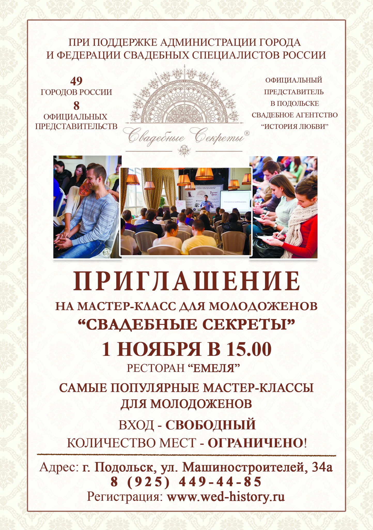 Уже четвертый год наше агентство проводит в Подольске мастер-класс для молодоженов «Свадебные Секреты». За это время он стал супер популярным!