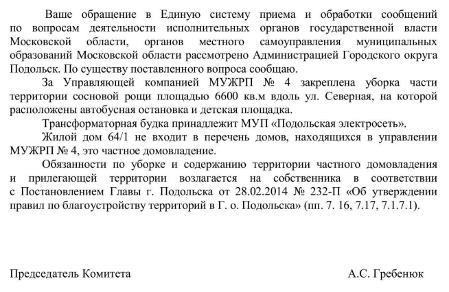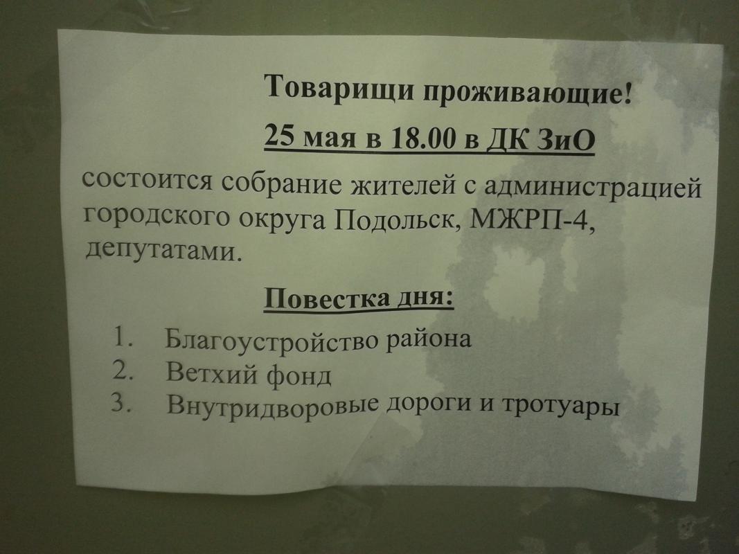 http://www.admpodolsk.ru/index.php?cate ... cleid=1026Мы жители Подольска проживаем по адресу улица Мира под. 2 дом 19. В нашем подъезде на первом этаже есть комната под название Колясочная. Там собираются мужчины, которые пьют спиртные напитки, курят и играют в карты. На неоднократные звонки в наш дез с просьбой навести порядок в этой комнате. Ничего не было сделано. Было направлено письмо руководству за ном. 1291 от 28 января 2015. Ответа не последовало. Был разговор с человеком который не посредственно должен заняться этой комнатой. Просили заменить замок и опечатать комнату. На что нам ответили, они не могут войти в комнату, так как когда они приходят, то там никого нет. Так попросили взломать замок в комнате и поставить новый. И опять тишины. А мужики как собирались там так и собираются.Мы боимся как бы не произошло что нибудь плохое, как в Воронеже. Просим Вас разобраться с этим делом и принять соответственные меры