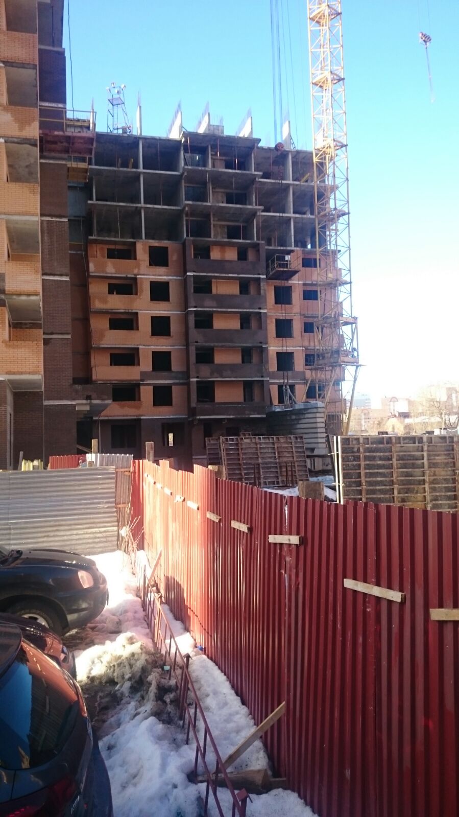 Был сегодня на стройке. 7 этаж полностью обложен. На 8 краном поднимают кирпичи и блоки. Наверху тоже работают, 10 этаж с наружней стороны залит, осталось немного с внутренней стороны. Рабочие видны и внутри, и наверху