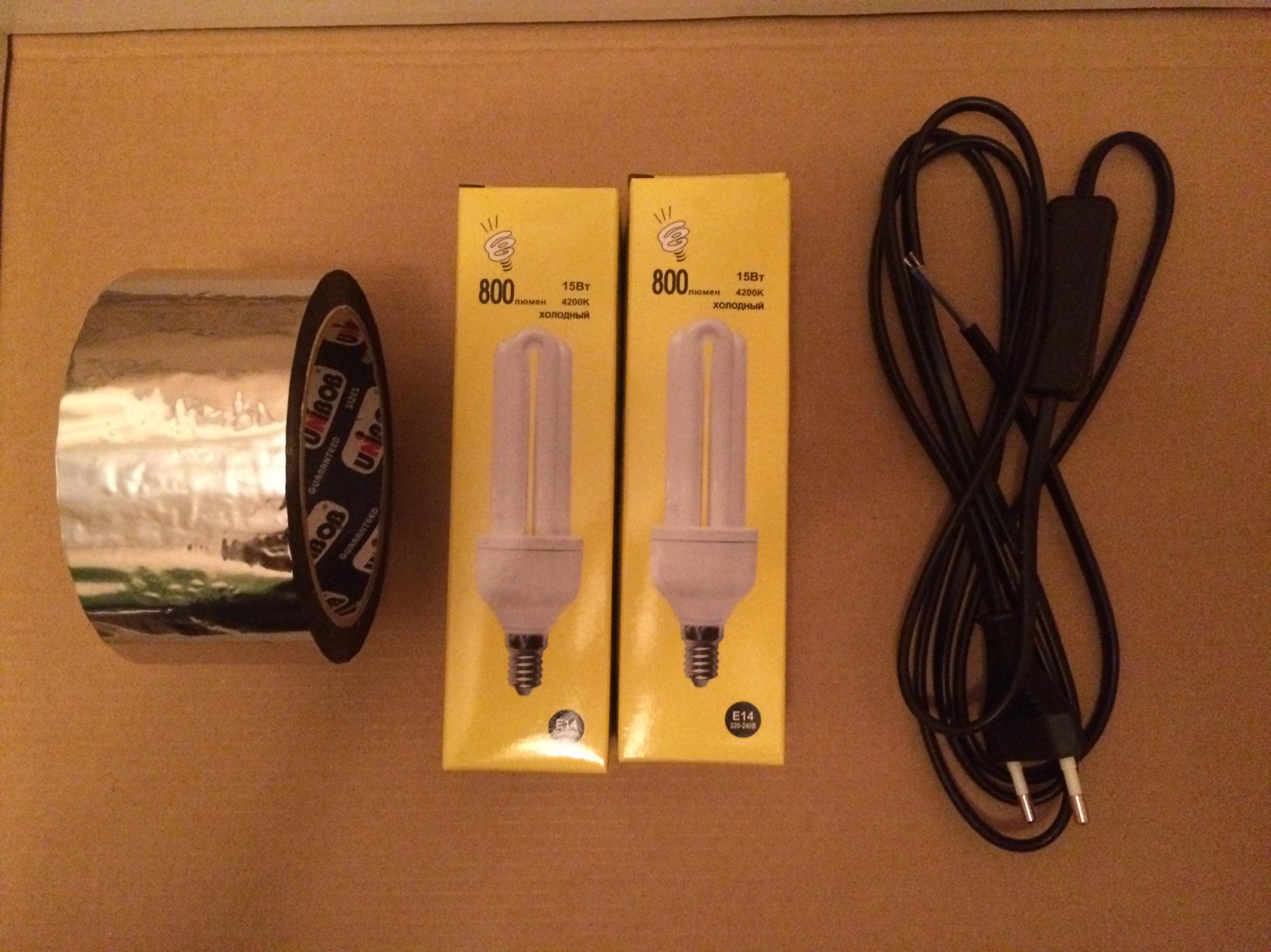 Можно ещё дырочки не заклеивать в верху, чтобы конденсат не копился. Оголённые провода лаком покрыть. Можно наверное и четыре лампочки вкрячить, с разным спектром, пару переключателей для раздельного включения если короб жёсткий.