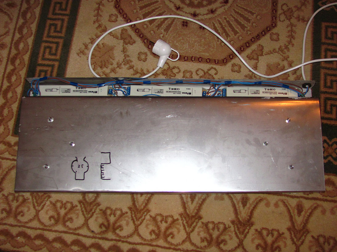 Отражатель из нержавейки 0,2мм. На каждую лампу своя ЭПРА, т.к. планировалось сделать дополнительных 3 выключателя. Но нужных инструментов под рукой не оказалось.