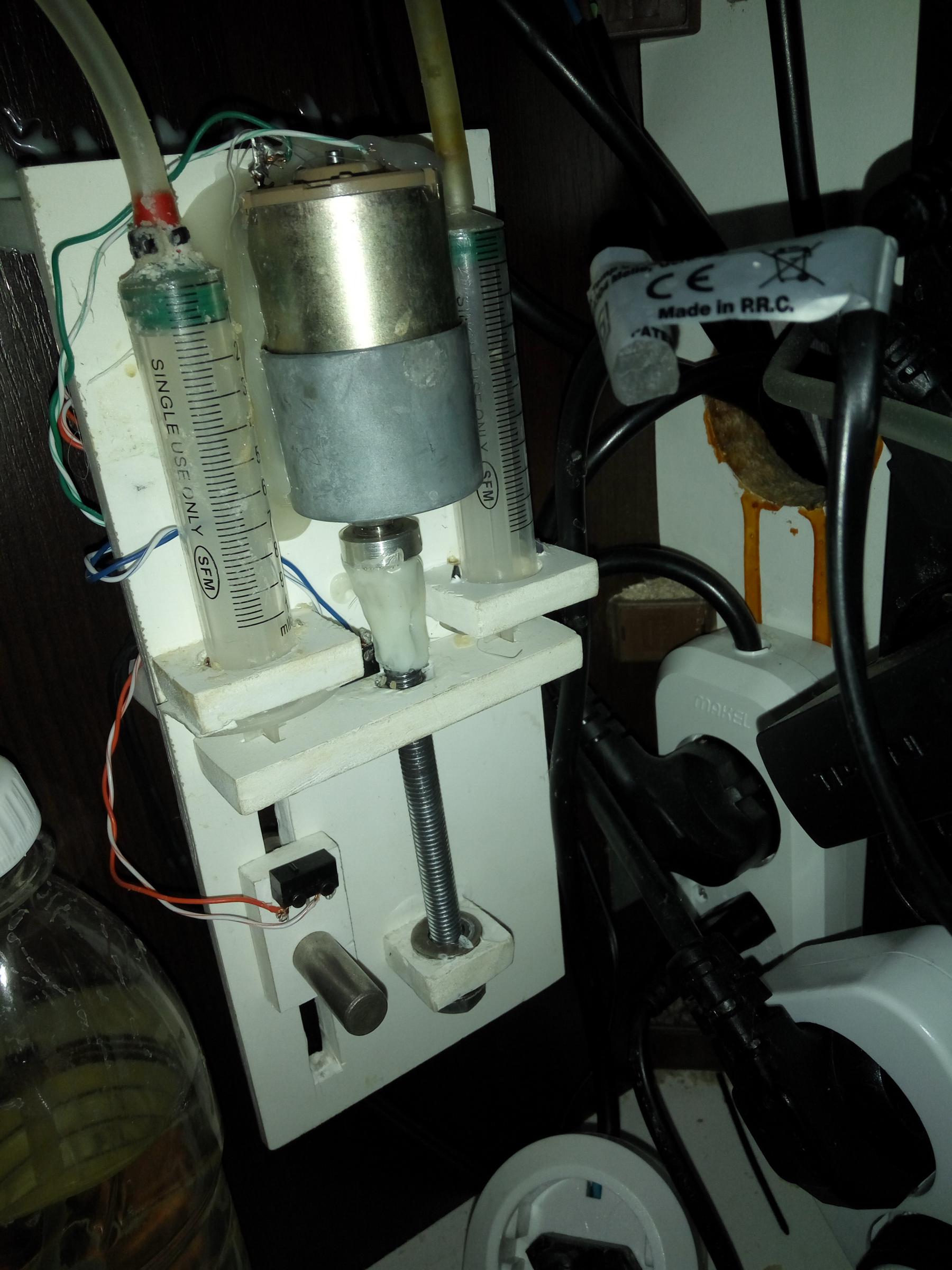 Мой механизированый вариант дозатора. Состоит из 2-х шприцев, мотора, винта, релюшки на 220v и 2-х микровыключателей из растерзаной компутерной мышки собрано на корпусе из вспененого пвх. Может работать на 2 канала, только количество будет одинаковым и дозировать придется концентрацией. Пашет больше года. Срабатывает по суточному таймеру. Использую для подачи макроудо. Кому надо эл. схемку накидаю.дядя Женя писал(а):Вобщем потратил время на рисунок чудо насоса из обратных клапанов и шприца. Иначе ни кто не понимает.