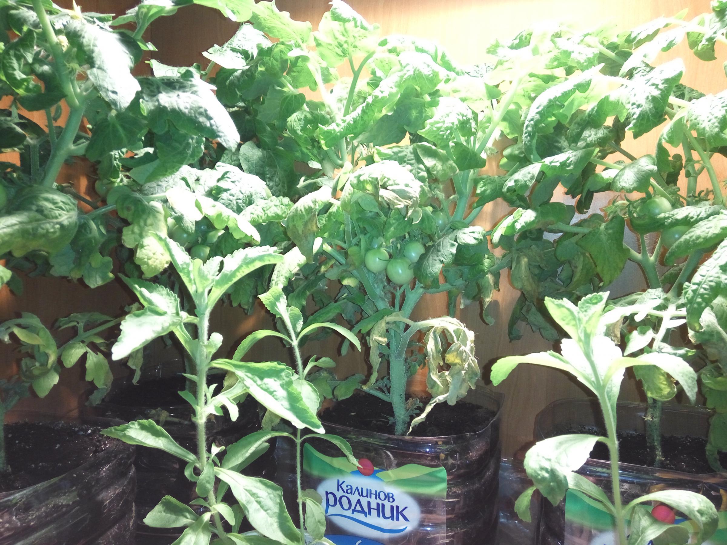 А это это мне зелени захотелось зимой. Черри под металлогалогенкой, а перед ней стевия. Уже сладкая