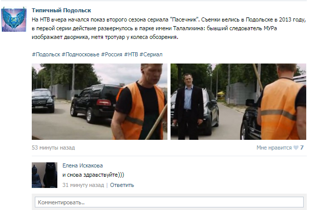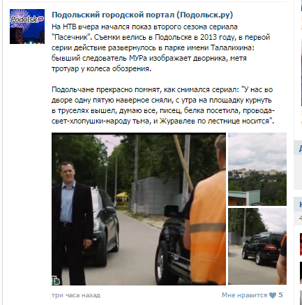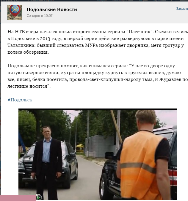 Светлана Агафонова писал(а):Странное замечание какое то, взяли и взяли, 80% сериалов НТВ можно скринить, так как они снимают их в Подольске, почти весь сериал Дикий был снят в Подольске, также очень много фильмов, если покопаться приличный список будет...