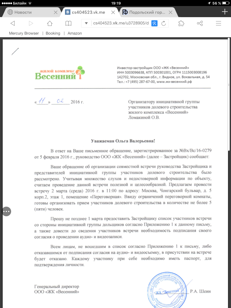Здравствуйте. Готова прийти на собрание.Legion_o писал(а):Получен ответ от застройщика на проведение официальной встречи.