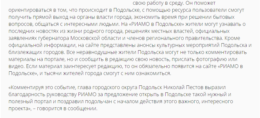 «РИАМО в Подольске» станет первым городским порталом, где сообщения жителей станут основой для написания журналистских материалов. Получится, что информация на портале будет более проработанной, проверенной.