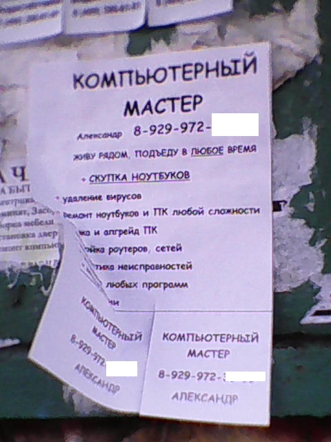 Временами на доске для объявлений у входа в подъезд или на двери в подъезд и в некоторых других местах (например, на фонарном столбе) появляются объявления про компьютерщика с фото в очках с надписью "Живу рядом". Ничего себе рядом (!), если такие объявления встречаются и в Парковом районе, и в Центральном районе, и в Межшоссейном районе, и в Зеленовскком районе... Часть таких объявлений я, проходя мимо, содрал и выкинул.