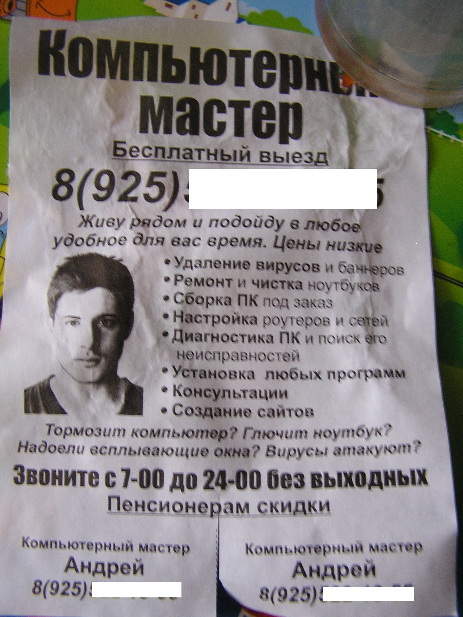 Временами на доске для объявлений у входа в подъезд или на двери в подъезд и в некоторых других местах (например, на фонарном столбе) появляются объявления про компьютерщика с фото в очках с надписью "Живу рядом". Ничего себе рядом (!), если такие объявления встречаются и в Парковом районе, и в Центральном районе, и в Межшоссейном районе, и в Зеленовскком районе... Часть таких объявлений я, проходя мимо, содрал и выкинул.