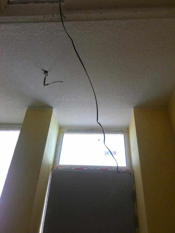 Собственно, по 7 секции до 16 этажа включительно холод собачий, в квартирах тоже холодно. На пролете 12го этажа нет двери на балкон, так же на пролетах нет освещения, только выведенные провода. По нашему, 16 этажу в холле, светильники висят. С улицы на первом этаже (с какого этажа выше тянется не обратила внимание, есть фото) со стороны двора висит куча проводов. Видимо это те самые провода, чтобы хоть какое-то эл-во было на время ремонта. Строй эксперт (двое горе рабочих) таскали на верхние этажи мешки со смесями.