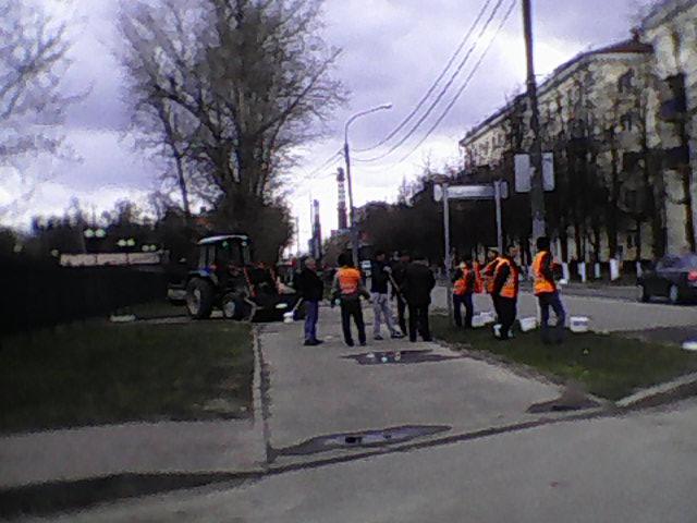 Я вчера лично видела, как на этом самом месте (у курсантов) брюнет в обыкновенной желтой куртке подметал смет у бордюров. Другие рабочие были в оранжевых жилетах и кучковались у конусов. Почему-то именно этого героя с метлой бросили одного. Видимо, так проверяют новых членов коллектива - если выжил, то годишься.
