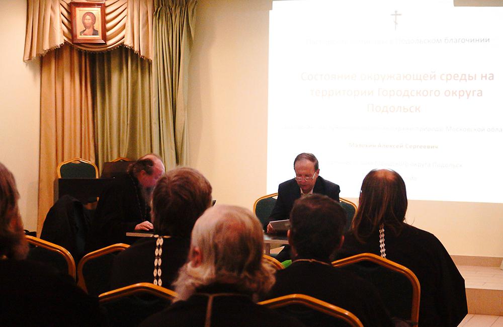 http://podolskoe-blago.ru19 апреля в Воскресенском храме ГО Подольск прошел пастырский семинар: «Состояние окружающей среды на территории Городского округа Подольск». Перед духовенством благочиния выступил заслуженный работник охраны природы Московской области Алексей Сергеевич Мазохин. В докладе были затронуты актуальные проблемы воздуха, водных ресурсов и лесопосадок района. Клирики храмов получили исчерпывающие ответы на интересующие вопросы, в частности истории техногенных аварий, технологии восстановления экосистем.