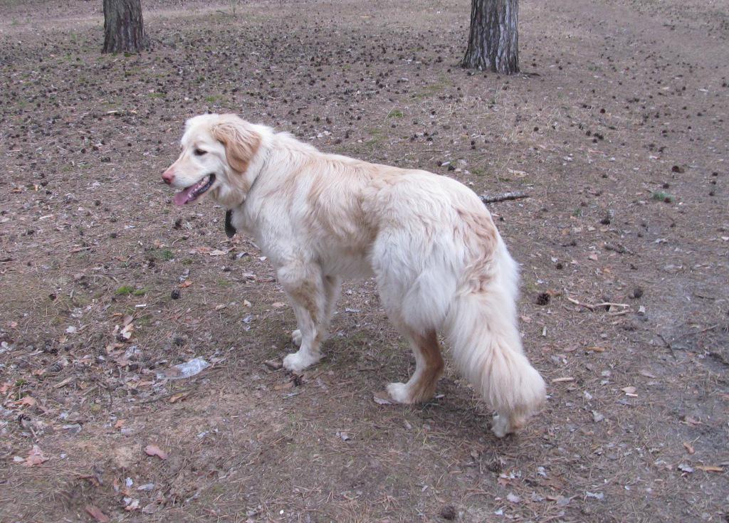похожа на золотистого ретривера, может быть грязной, со свалявшейся шерстью.