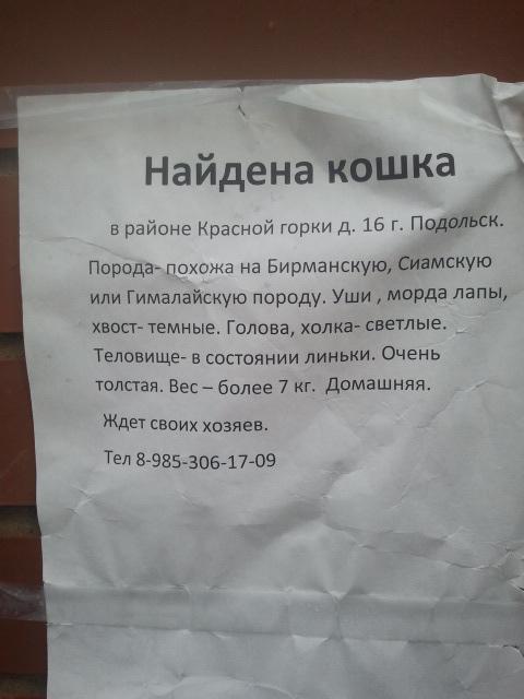Найдена Бирманская кошка (ул.Б.Серпуховская-район 2-х проходных Зингера) .Хозяева, старые или новые, звоните!!! 8-916-615-78-79