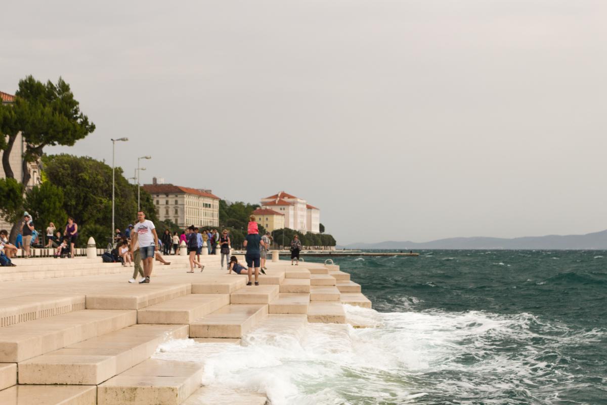 Потом я вернулся поработать, а середине июня продолжили городом Задар. Самое прикольное в нем - морской орган на набережной. Порядка 30 труб вмонтированы в набережную и хитро соединены с морем. Колебания волн вызывают движение воздуха в них и на выходе из дырок в мостовой появляется чудесный звук. Работает круглосуточно и без затрат, в шторм был слышен за километр точно. Оттуда съездили в нац.парк - Крка. Менее интересно, чем Плитвицкие озера, но в целом очень неплохо, хотя весь маршрут на кораблике проходить не стали - хватило пешеходной части по водопадам. Пока никого не было удалось даже постоять под одним из них. В нижней части официально разрешено купаться. Там же - первая гидроэлектростанция в Европе, построенная Теслой.