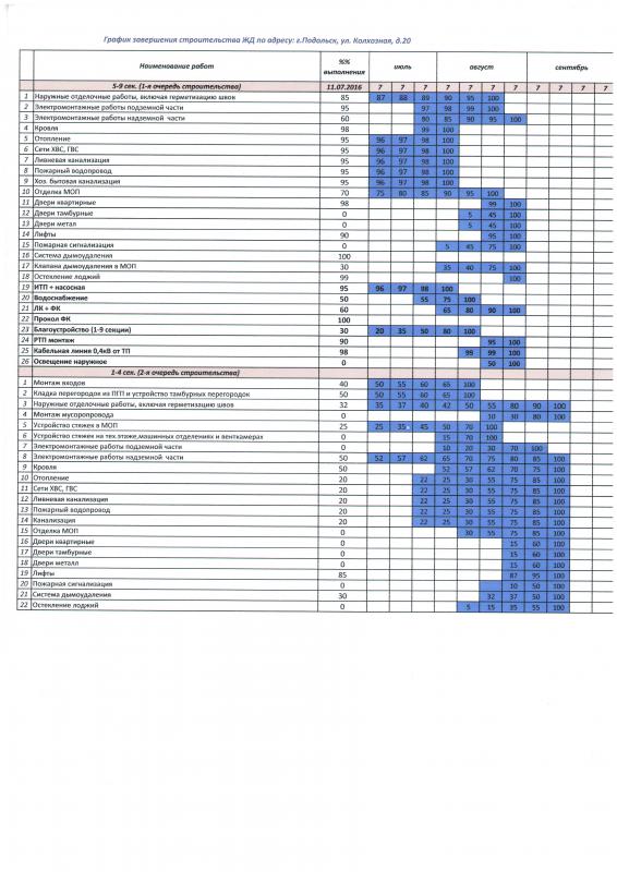 Лживый график производства работ, а как по-другому можно смотреть на этот "документ" в отсутствии подписи Дискома и подрядчика, преследует только одну цель: Диском и его покровители в Администрации г.Подольска изо всех сил пытаются не допустить скандала с дольщиками до проведения выборов в Госдуму, которые должны пройти 18 сентября 2016 г.